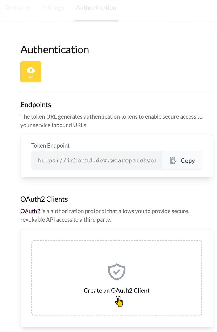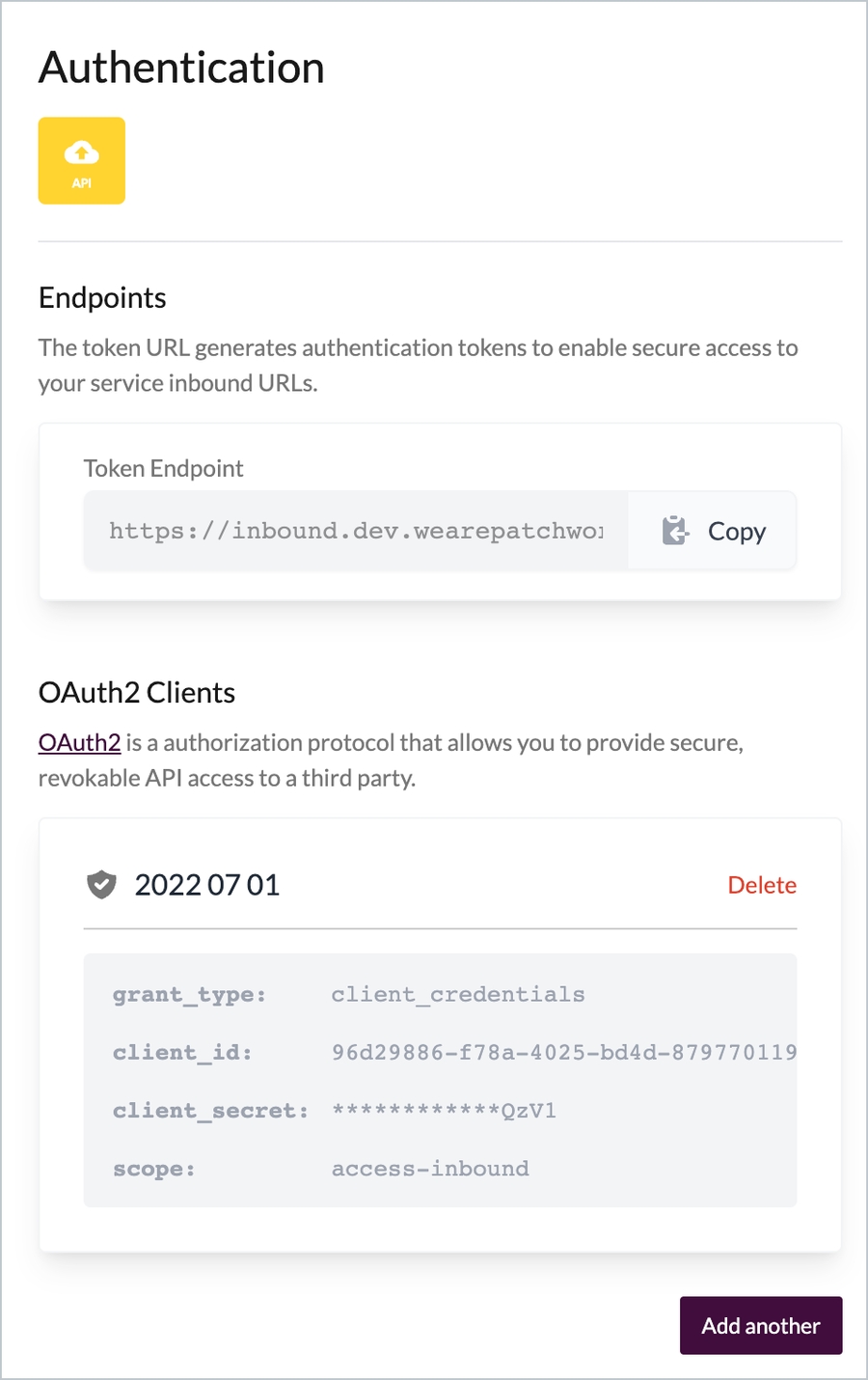 Use the authentication tab for an Inbound API connector to obtain/generate details required to request access tokens for secure access to the inbound URL for a Patchworks service. You will need: