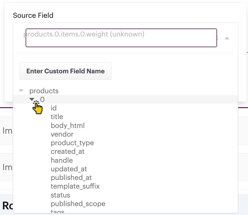 If needed, you can use the enter custom field button to map a non-standard field. This is particularly useful if you've created custom fields in a system (for example, Netsuite) which need to be synced.