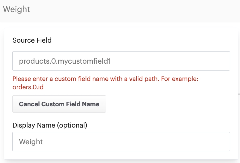 It's important to note that custom field values must adhere to the top-level schema path for the associated system - typically this will be orders.0, products.0, customers.0, etc. For example: