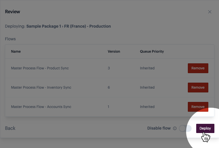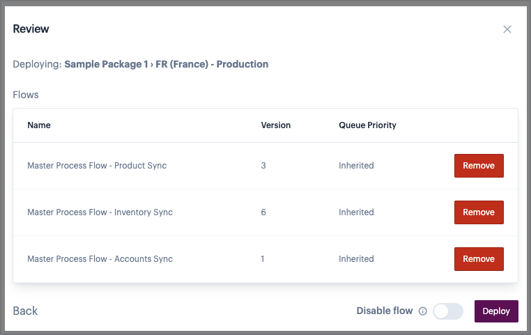 * By default, process flows are `enabled` when deployed via a package. You can use the `disable flows` toggle option to deploy flows as `disabled`, so they exist in the target environment but do NOT run automatically.&#x20;