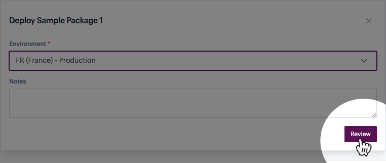 Optionally, you can add notes for this deployment - after this, click the `review` button: