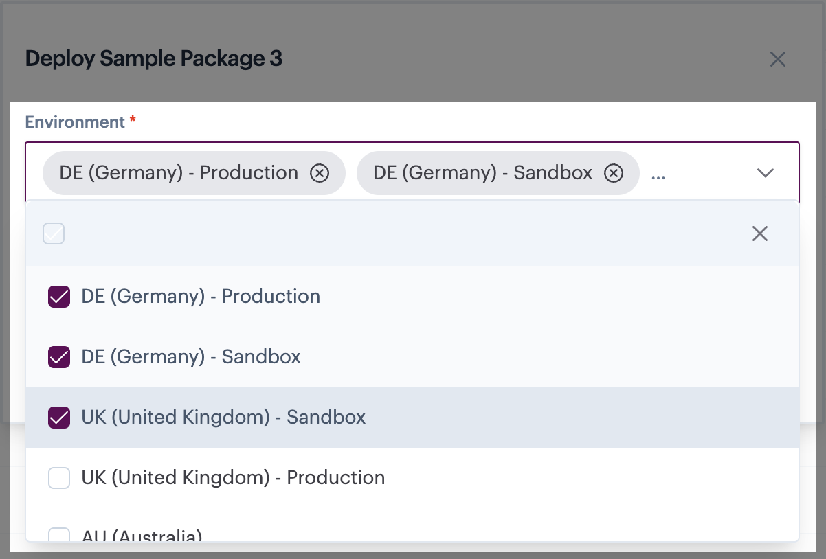 Use check boxes to select one or more environments - or use the 'select all' checkbox to select all envrionments.